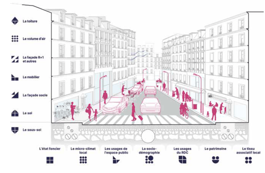 - Définir les composantes qui permettent de penser une expérience unifiée dans un lieu de vie et les prendre en compte en collaboration avec les parties prenantes, notamment les urbanistes et les designers, pour améliorer l’expérience vécue (ex Rue Commune : composantes immatérielles – l’état foncier, le micro-climat local, les usages de l’espace public, la socio-démographie, les usages du RDC, le patrimoine, le tissu associatif local – et composantes matérielles – la toiture, le volume d’air, la face R+1 et les autres, le mobilier, la façade socle, le sol, le sous-sol)